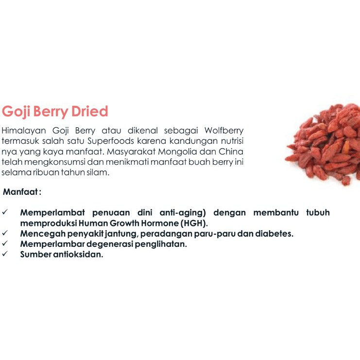 Goji Berry atau disebut dengan Super Fruit adalah buah yang paling kaya dengan nutrisi berasal dari Tibet di dataran tinggi Gunung Himalaya kaya akan vitamin mineral protein dan antioksidan. Beta-karoten sangat penting untuk kesehatan mata tulang kulit dan sel. Buah goji berry adalah antioksidan terbaik bagi kulit.